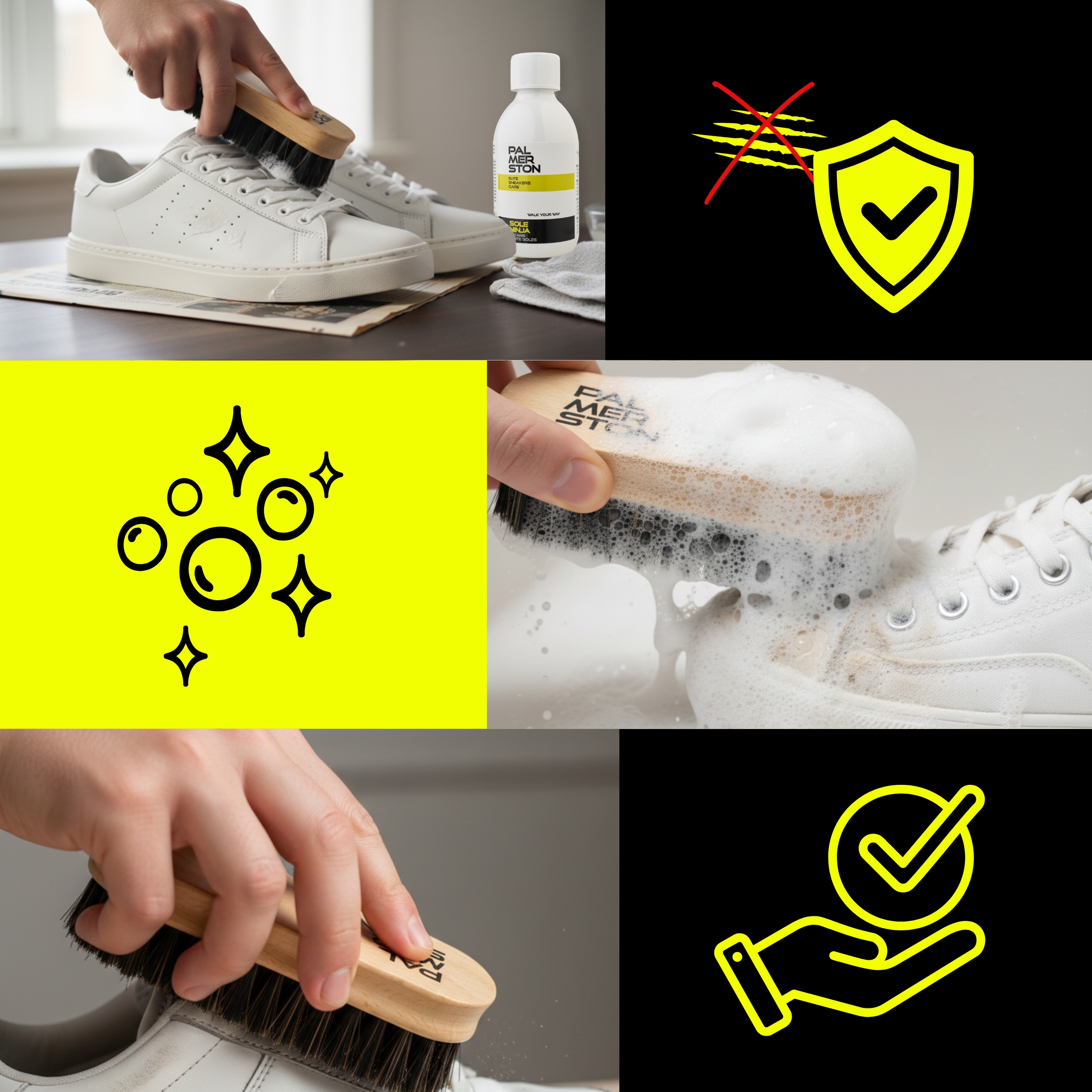 Szczotka do butów mała Palmerston została zaprojektowana głównie z myślą o skórze i galanterii skórzanej. Używanie jej na innych materiałach może nie przynieść oczekiwanych rezultatów lub może je uszkodzić. Zaleca się stosowanie jej wyłącznie do obuwia skórzanego.