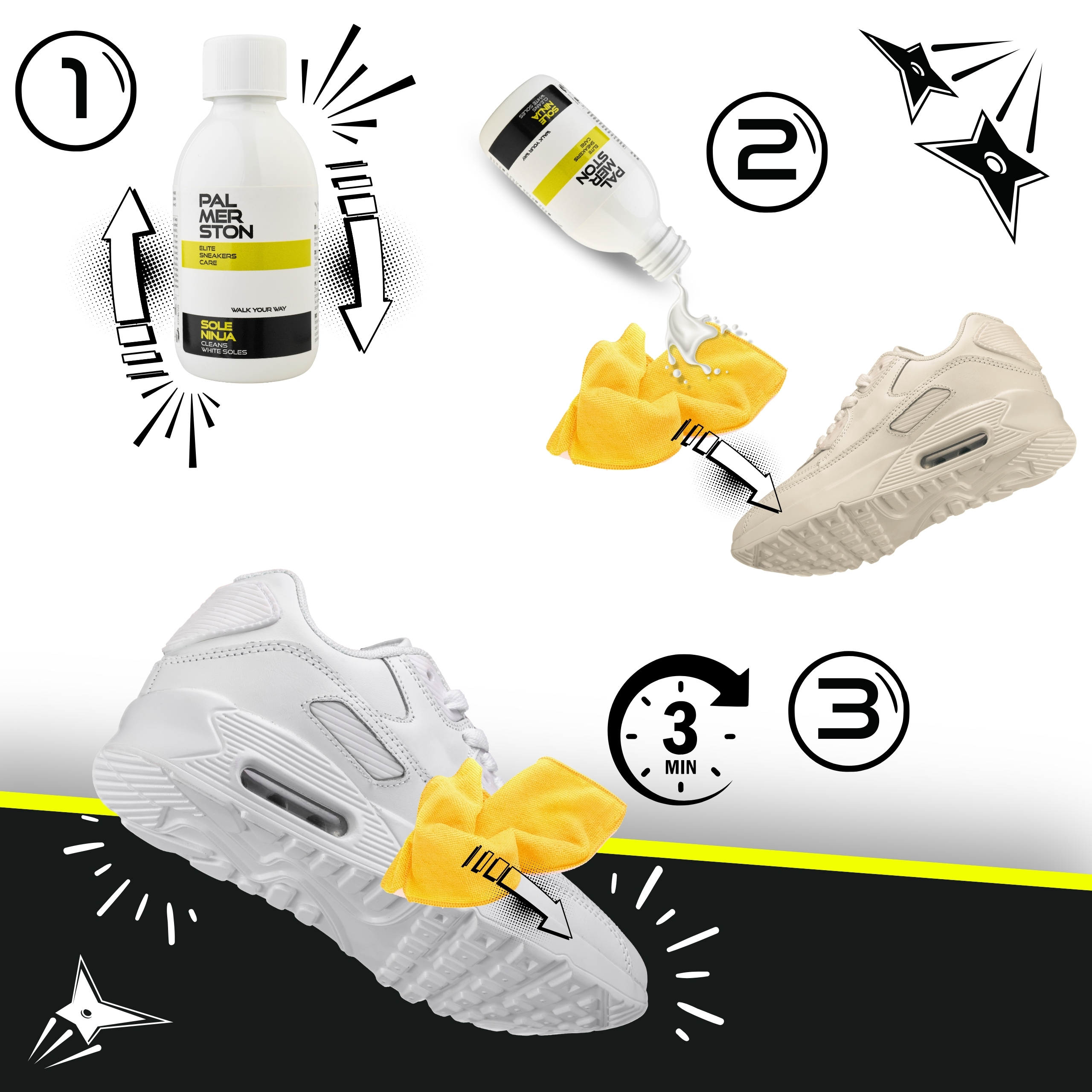 Zmywacz do podeszw SoleNinja Palmerston to skuteczny płyn przeznaczony do czyszczenia podeszew obuwia. Dzięki swojej innowacyjnej formule, produkt ten przywraca blask nawet najbardziej zabrudzonym białym, beżowym oraz szarym podeszwom. Idealny dla miłośników sneakersów, SoleNinja jest doskonałym rozwiązaniem do odświeżania obuwia casualowego i sportowego.